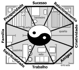 Em outra figura (clique aqui para ver), temos um exemplo da planta de uma residência com o Bagua aplicado e posicionado. Observando novamente essa figura, vamos notar que cada lado do Bagua está localizado em um ou dois cômodos da residência, que são justamente os pontos energéticos de cada "gua".
